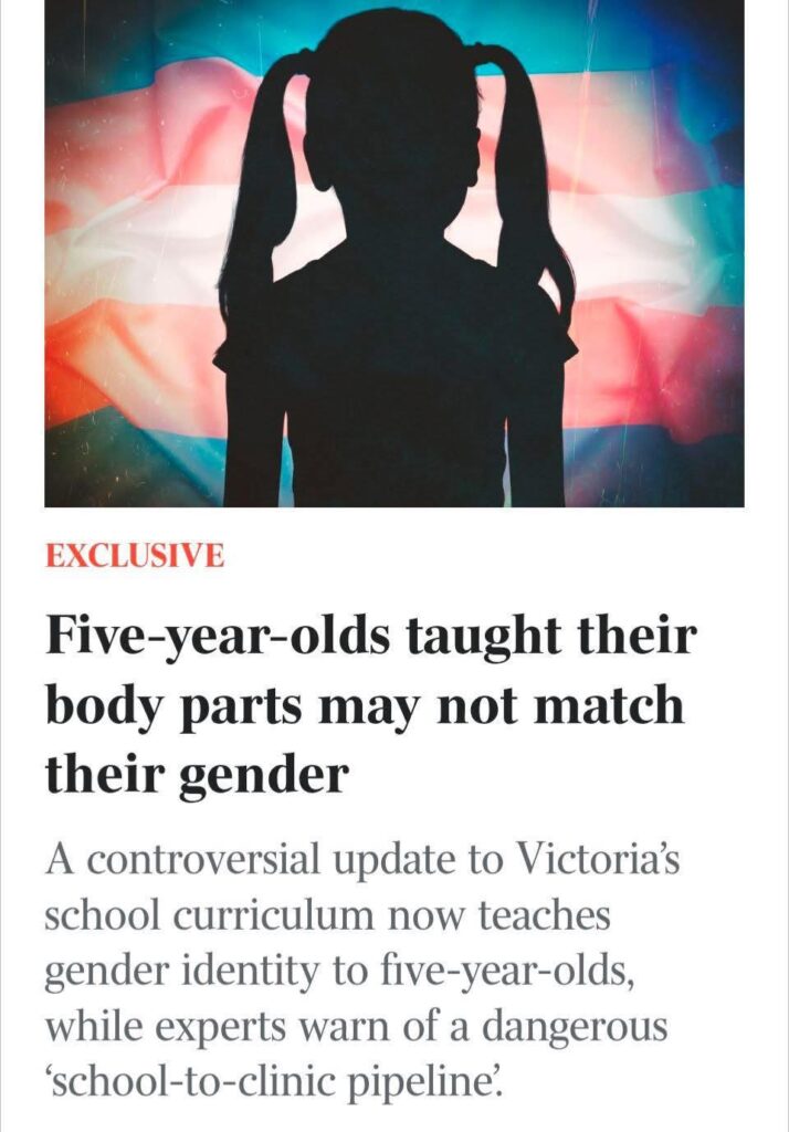 The Victorian Department of Education’s own lesson plans now teach that a child’s body parts may not match their “true” gender and promote biological males playing in girls’ sports.