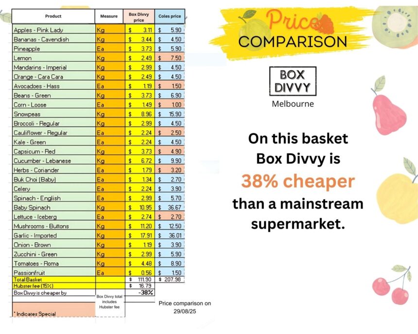 What began as a small street co-op run by husband-and-wife team Jayne Travers-Drapes and Anton van den Berg has evolved into a modern online food co-op, with more than 330 neighbourhood Hubs across NSW and the ACT now helping over 15,000 households access fresh produce and pantry staples at prices that are, on average, 30% cheaper than supermarkets. Box Divvy sources from mostly Australian farmers, family-owned growers and ethical local suppliers – prioritising seasonal, transparently priced food. over mass-produced, imported goods. ((A recent Coles price check on August 29 in Melbourne confirmed Box Divvy is 38% cheaper than a mainstream supermarket).
