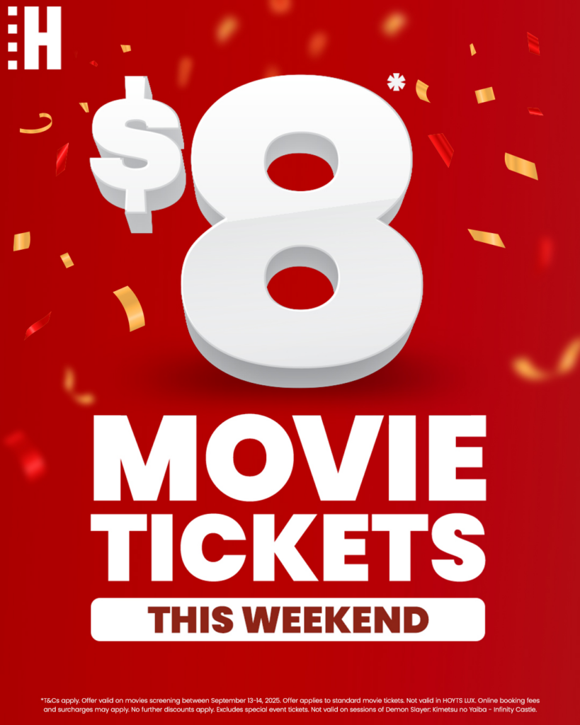 HOYTS Cinemas is celebrating an incredible 116 years with a special treat for cinema lovers, honouring more than a century of unforgettable entertainment experiences. For movie sessions this weekend, Saturday 13 – Sunday 14 September, standard tickets across all HOYTS cinemas will be just $8, giving guests the perfect chance to join the celebration and enjoy a blockbuster on the big screen.