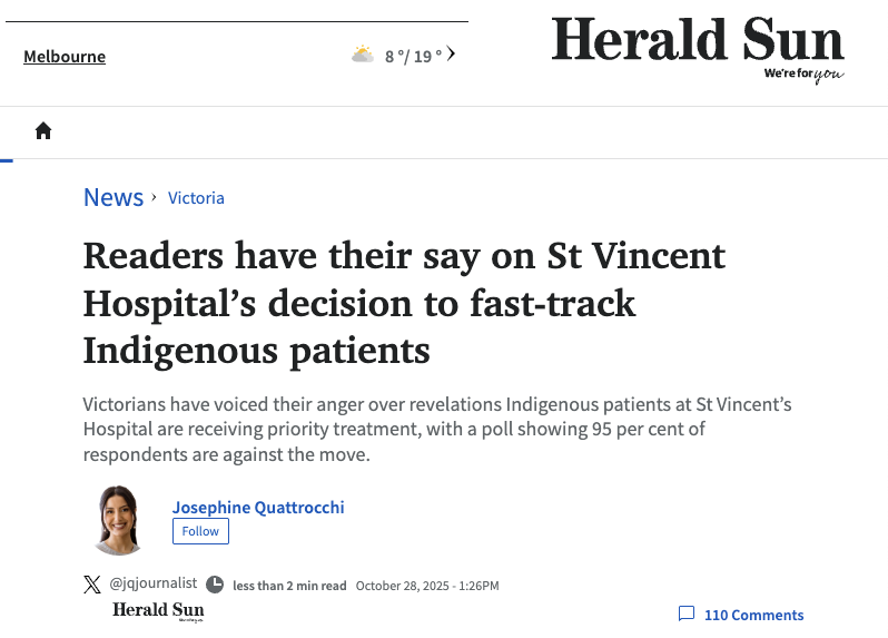 The Herald Sun revealed this week that St Vincent’s Hospital had implemented a policy requiring all Indigenous patients to be treated within 30 minutes of arrival — the first such race-based triage policy in Australia. A public poll showed that 95 per cent of respondents opposed the move.