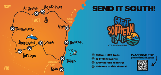 Great Southern Trails is a Destination Southern NSW tourism initiative showcasing the South Coast, Alpine Region, and the Capital as Australia’s ultimate MTB road trip touring route. It features 10 MTB trail networks across Southern NSW – Mogo, Narooma, Tathra, Eden, Cooma, Jindabyne, Thredbo, Tumbarumba, Stromlo, and Majura Pines – the network offers diverse terrain and experiences for riders of all levels from the mountains to the coast.