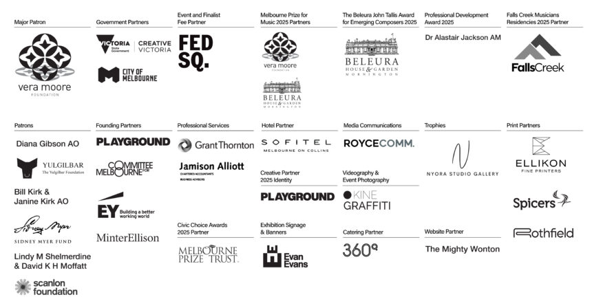 The Vera Moore Foundation is acknowledged and thanked for their most generous support as Major Patron and key partner of the Melbourne Prize for Music 2025 & Awards, along with The Tallis Foundation.