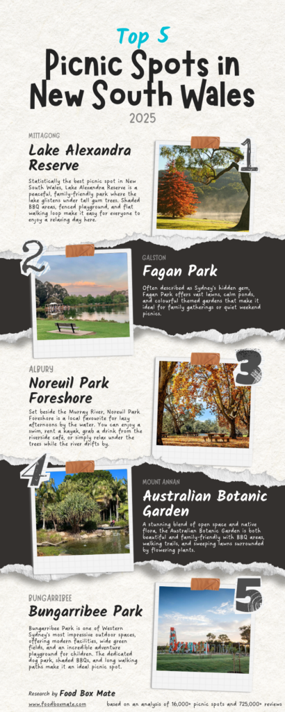 A visual summary of the top five spots, complete with photos and highlights, is available in Food Box Mate’s infographic at foodboxmate.com/nsw-favourite-picnic-spots
