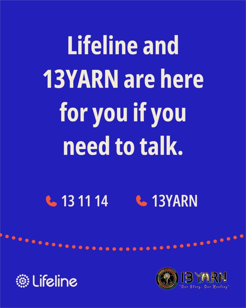 13YARN: Speak to an Aboriginal and Torres Strait Islander Crisis Supporter on 13 92 76 (24/7).