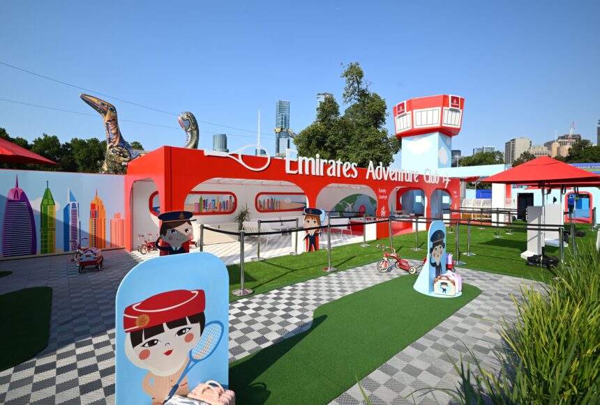 Located beneath an air traffic control tower, the Ballpark will feature the "Emirates Little Travellers" tiny trikes baggage track for younger children. It will also feature a robot navigation challenge for older kids, connecting all four Emirates-sponsored Grand Slams and a Dubai Frame-inspired activation, set against the Dubai city skyline, where Emirates Cabin Crew will capture polaroid memories for families daily.