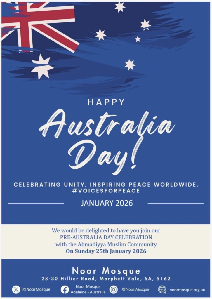 The Ahmadiyya Muslim Community in Adelaide invites you to its annual Pre-Australia Day celebrations on Sunday, 25th January, at the Morphett Vale Noor Mosque.