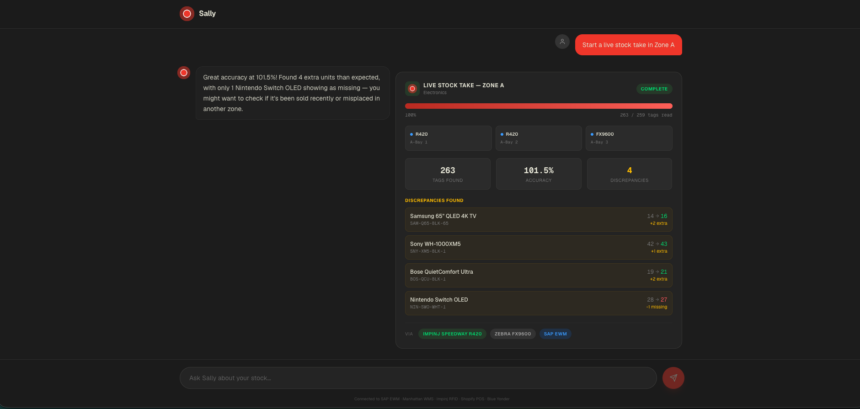 Sally connects to RFID readers across a retail site: fixed portals, handheld scanners, dock equipment, and layers a conversational AI interface on top. A staff member can ask where a specific product is located and receive an answer in seconds. A supervisor can initiate a full stocktake and receive a reconciled count against the system of record, with discrepancies flagged automatically.