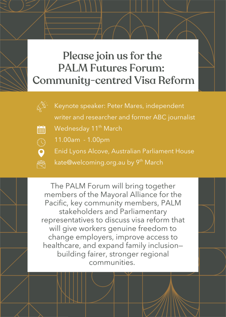 The PALM Futures Forum will bring together members of the Mayoral Alliance for the Pacific, key community members, employers, unions, researchers, PALM stakeholders and Parliamentary representatives to call on the Federal Government for visa reform that will give workers genuine freedom to change employers, improve access to healthcare, and expand family inclusion-building fairer, stronger regional communities.