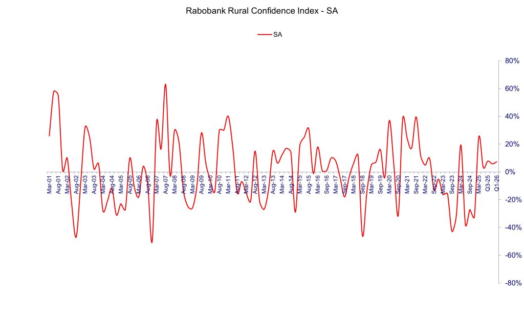 The quarter one Rabobank Rural Confidence Survey, completed last month, found South Australian farm sentiment tracking at a net reading of seven per cent.