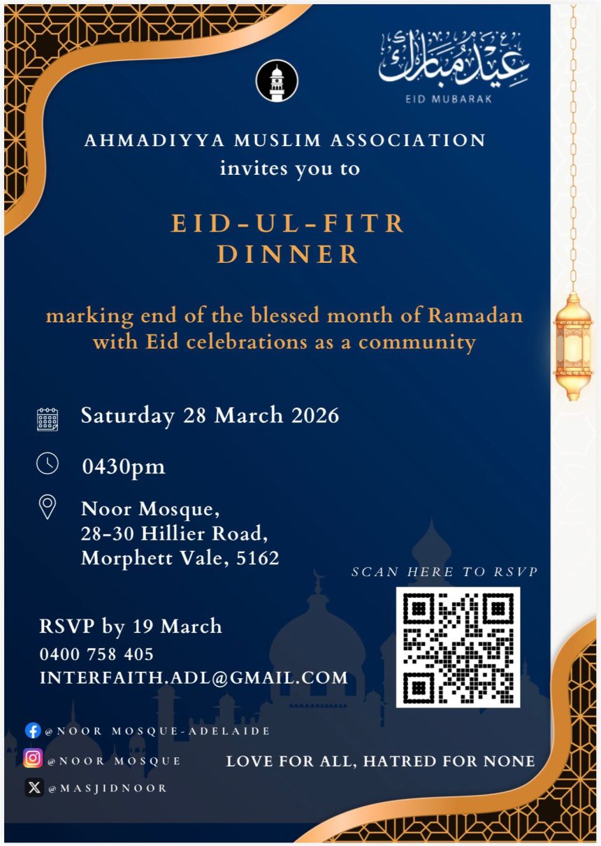 Marking the end of the sacred month of Ramadan. The Ahmadiyya Muslim Community Adelaide South Chapter warmly invites you to the Interfaith Seminar followed by an Eid ul Fitr Dinner at Noor Mosque in Adelaide’s Southern Suburbs on Saturday, 28 March 2026 at 4:30 PM.