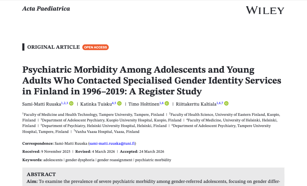 “A landmark study published in *Acta Paediatrica*, using nationwide Finnish health data, has found that young people diagnosed with gender dysphoria are already experiencing significantly higher rates of psychiatric distress — and that these rates worsen following medical interventions,” Mr Shelton said.