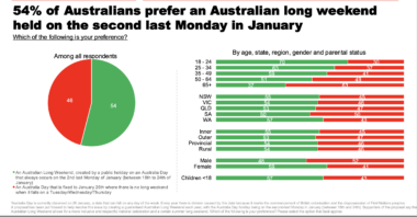 Key Facts: 54% of Australian voters prefer an Australian Long Weekend,created by a public holiday, that occurs on the 2nd last Monday in January,…
